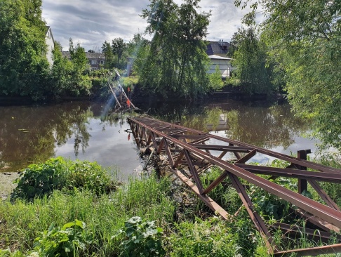 Воздушный трубопровод теплосети поддерживался металлическими конструкциями и проходил над рекой. Порыв ветра повалил старое дерево на теплосеть, и вся конструкция оказалась разрушена.