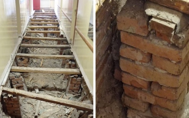Рабочие полностью демонтировали старый пол, заменили все лаги, столбики опоры и настелили новые полы и уложили линолеум. Работа была закончена и принята комиссией. Качество ремонта не вызывает нареканий.