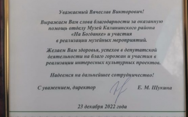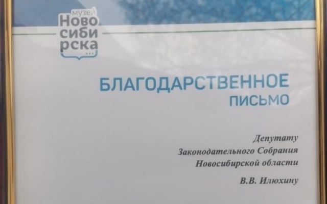 Директор музея города Новосибирска Елена Щукина передала депутату Законодательного Собрания Новосибирской области Вячеславу Илюхину благодарственное письмо, в котором выражает признательность за помощь и поддержку, которую депутат постоянно оказывает музею Калининского района «На Богданке».