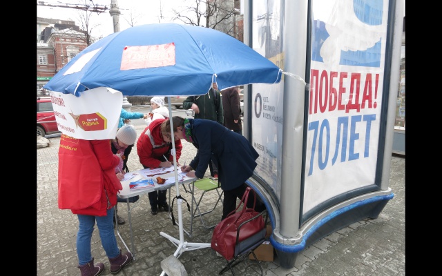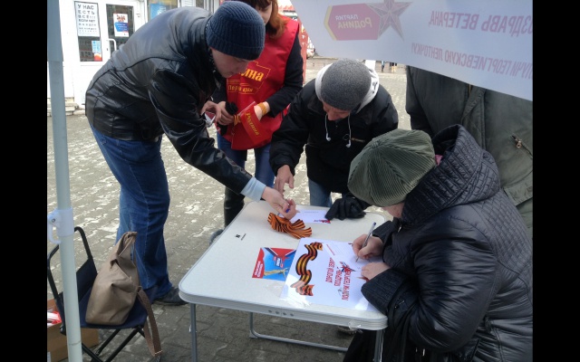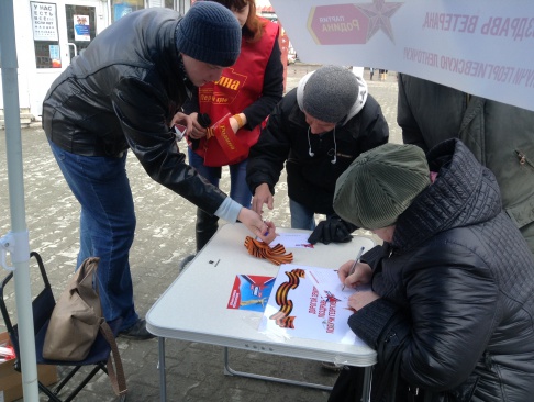 В выходные дни на центральных улицах Перми были развёрнуты пикеты по сбору поздравительных открыток, где каждый желающий мог написать поздравление ветерану войны. Каждому написавшему в подарок выдавалась георгиевская лента.