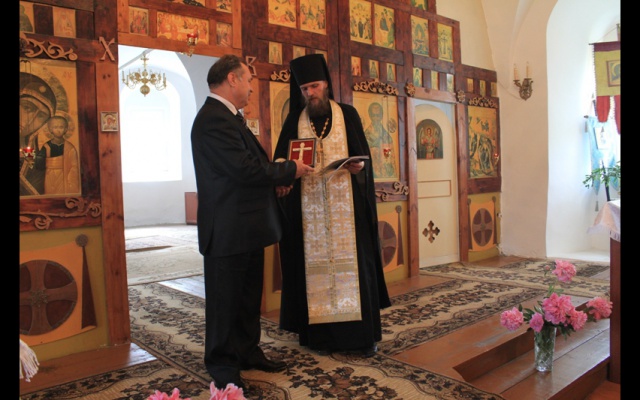 Шесть месяцев назад на меня спустилось озарение, вселилось в душу желание найти возможности и пути изготовить и доставить на мою малую родину в город Карачев, в этот монастырь копию Животворящего Креста Господня. По наставлению отца Никона на протяжении этого времени проводились работы, и сегодня, можно сказать, я исполнил ту миссию, на которую по воле Божией спустилось на меня озарение. Передаю в дар мужскому монастырю на вечное хранение эту святыню. Мы все просим отца Никона молиться за нас, за то, чтобы эта святыня всегда приносила всем верующим, всем прихожанам этого храма помощь Божию".